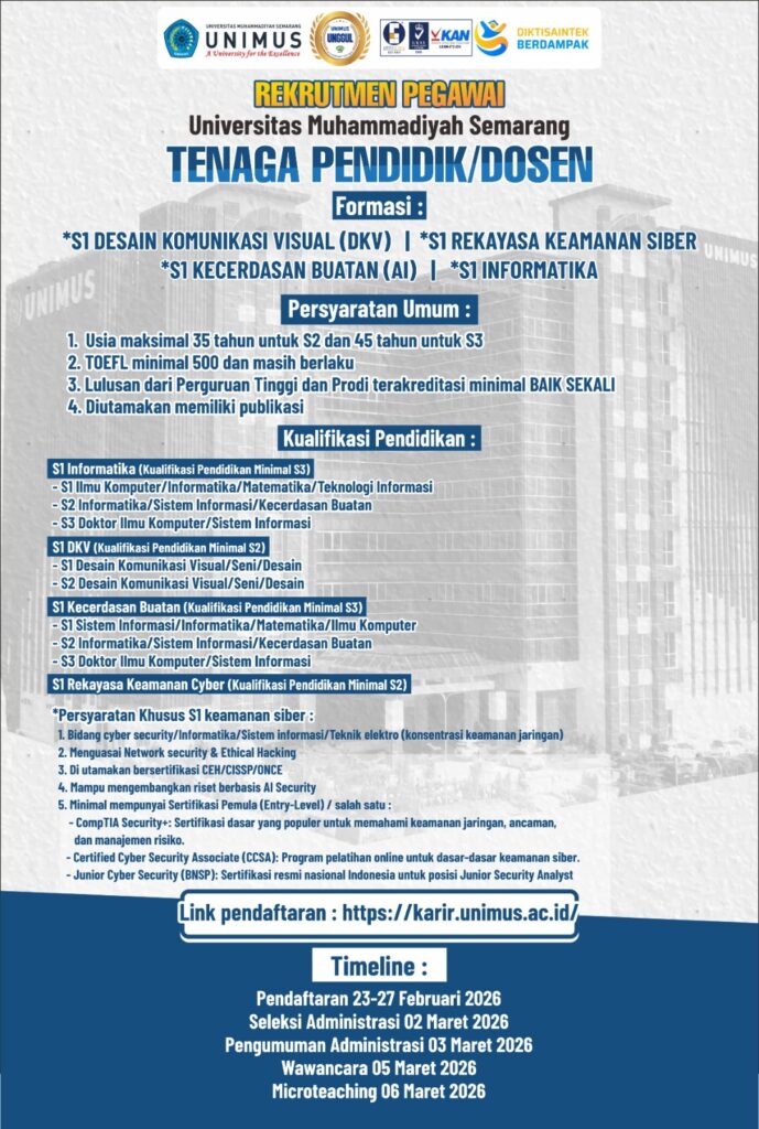 Post author:adminkarir Post published:February 23, 2026 Post category:Rekrutmen Assalamu’alaikum wr. wb. Bersama ini kami sampaikan Rekrutmen Pegawai (Dosen) Universitas Muhammadiyah Semarang Tahun 2026 sebagaimana terlampir. Wassalamu’alaikum wr. wb. Pendaftaran You Might Also Like REKRUTMEN UNIMUS PERIODE OKTOBER TAHUN 2023 November 3, 2023